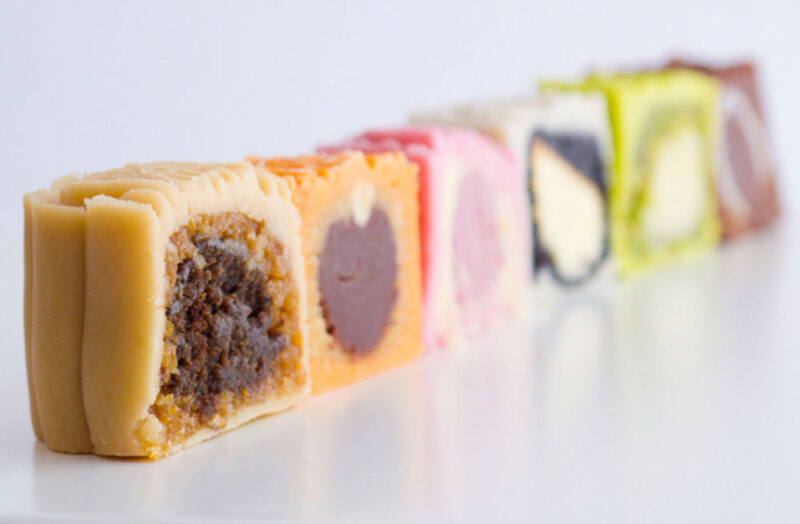 Los mooncakes son una pieza de pastelería china, una trufa dentro de otra, cubiertas por una fina capa externa y moldeadas a mano con moldes especiales. De distintos colores y sabores, son húmedos, consistentes y explosivamente ricos. Duran al menos 7 días en heladera.