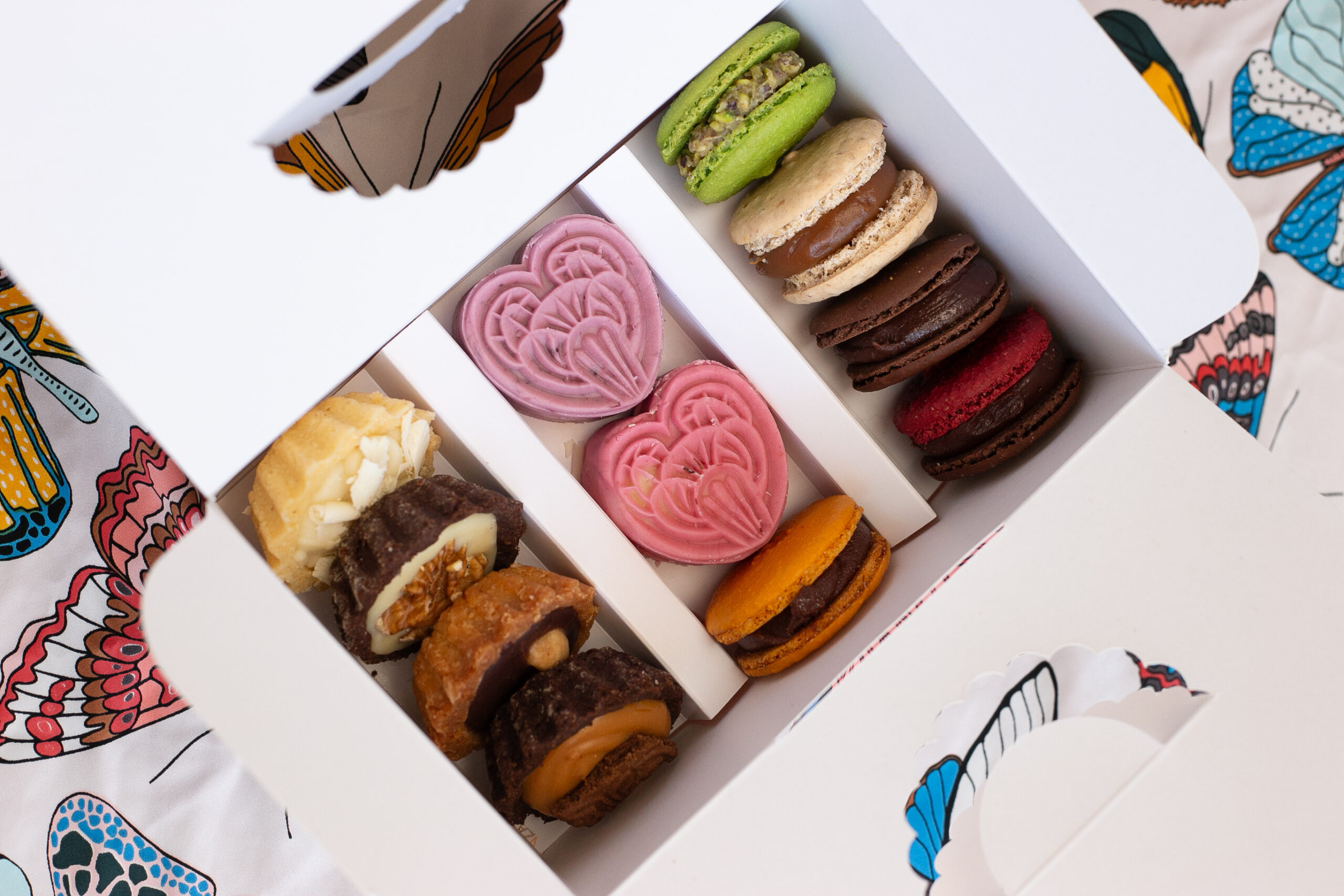 Caja surtida con 5 macarons, 2 mooncakes corazón y 4 tarteletas
